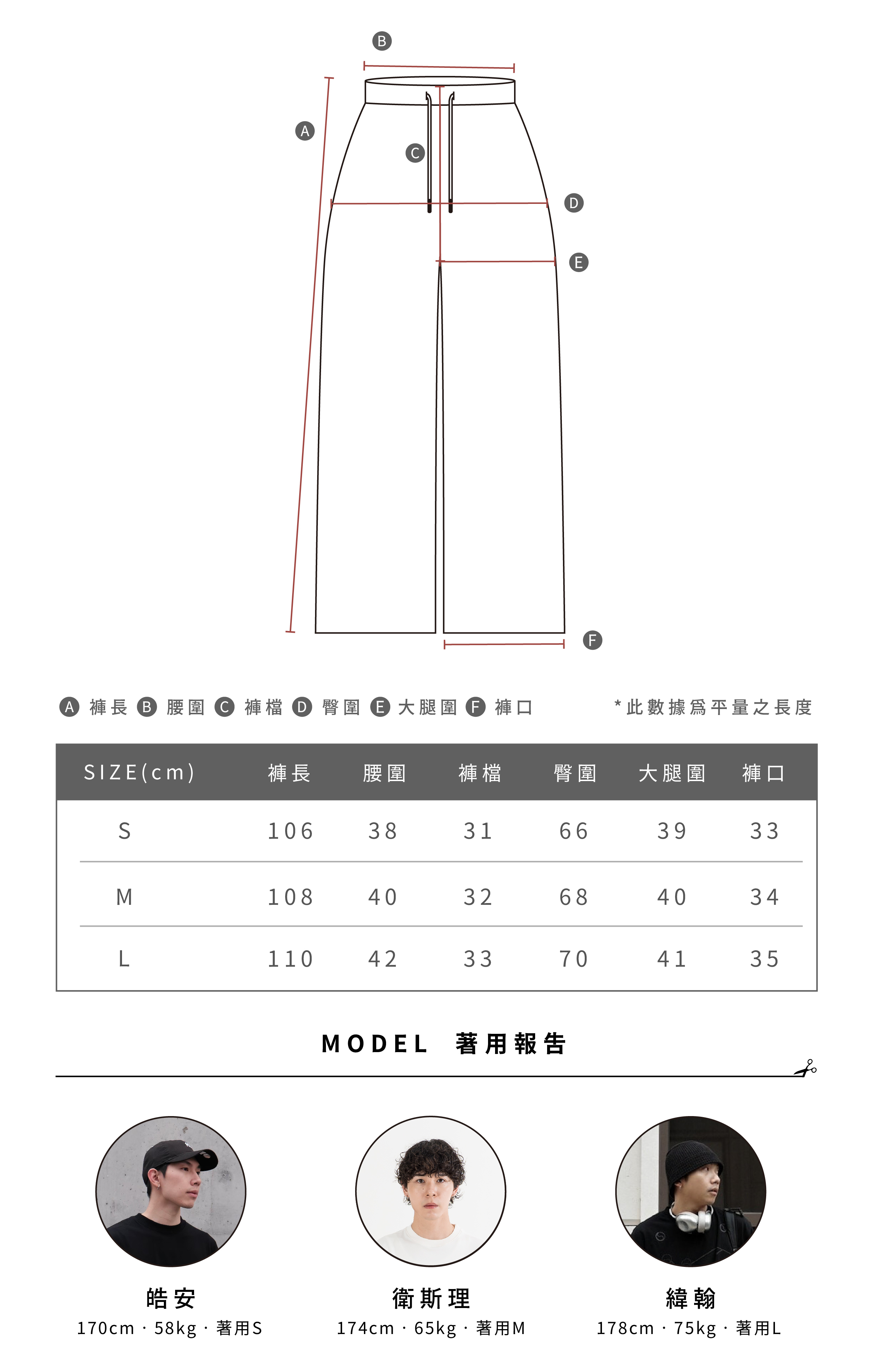 - 寬鬆闊腿落地版型,褲腳附抽繩可調節