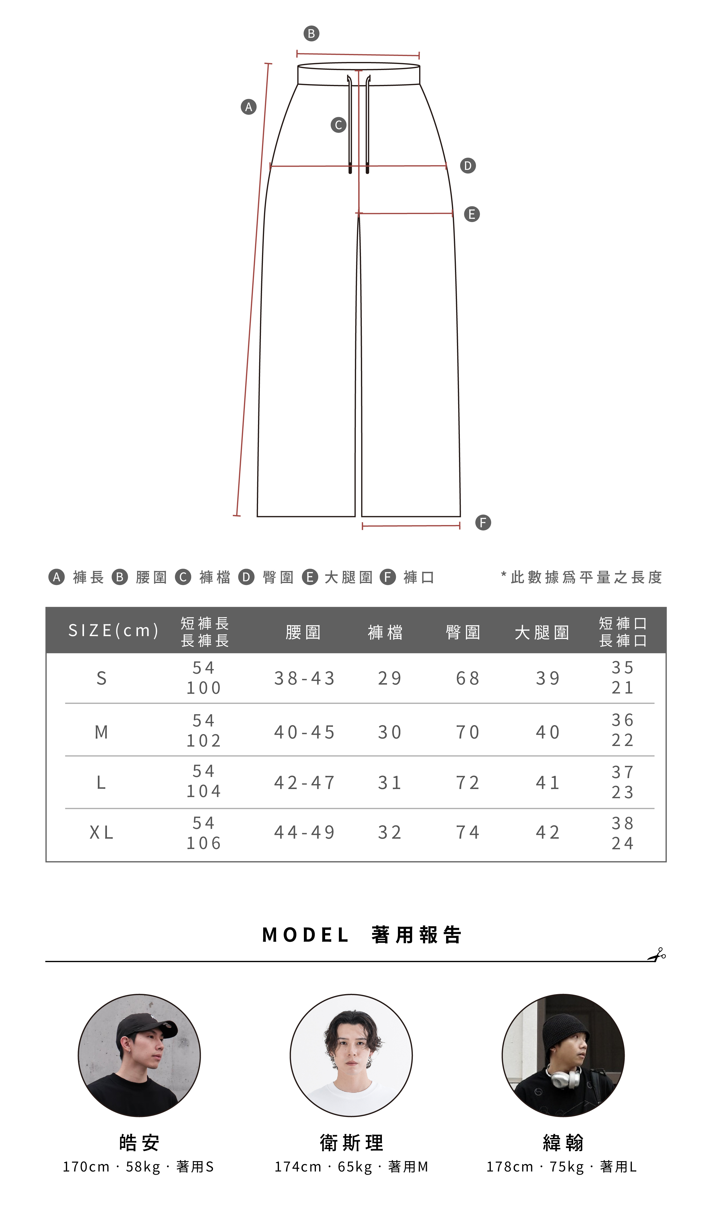 - 版型長褲寬鬆錐形,短褲寬鬆及膝