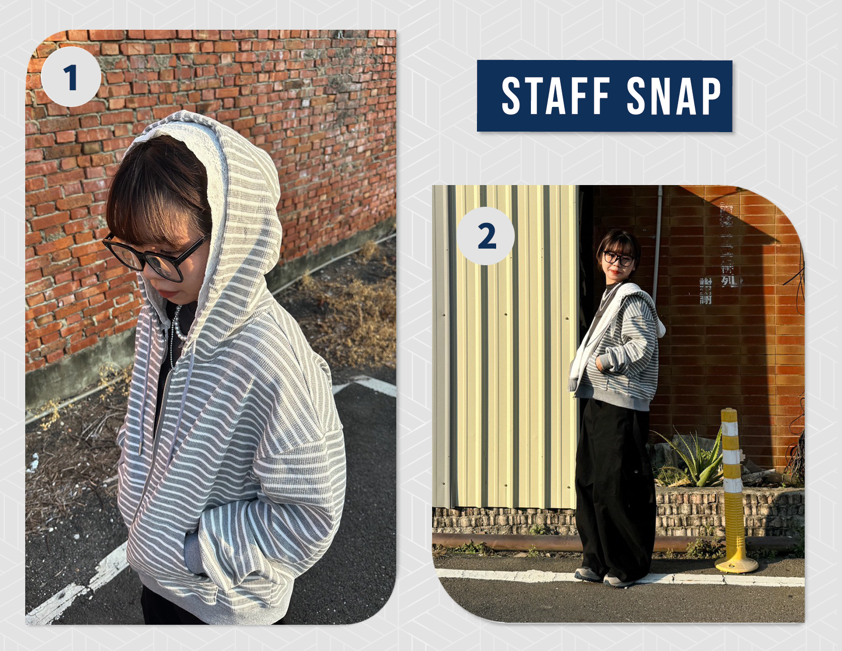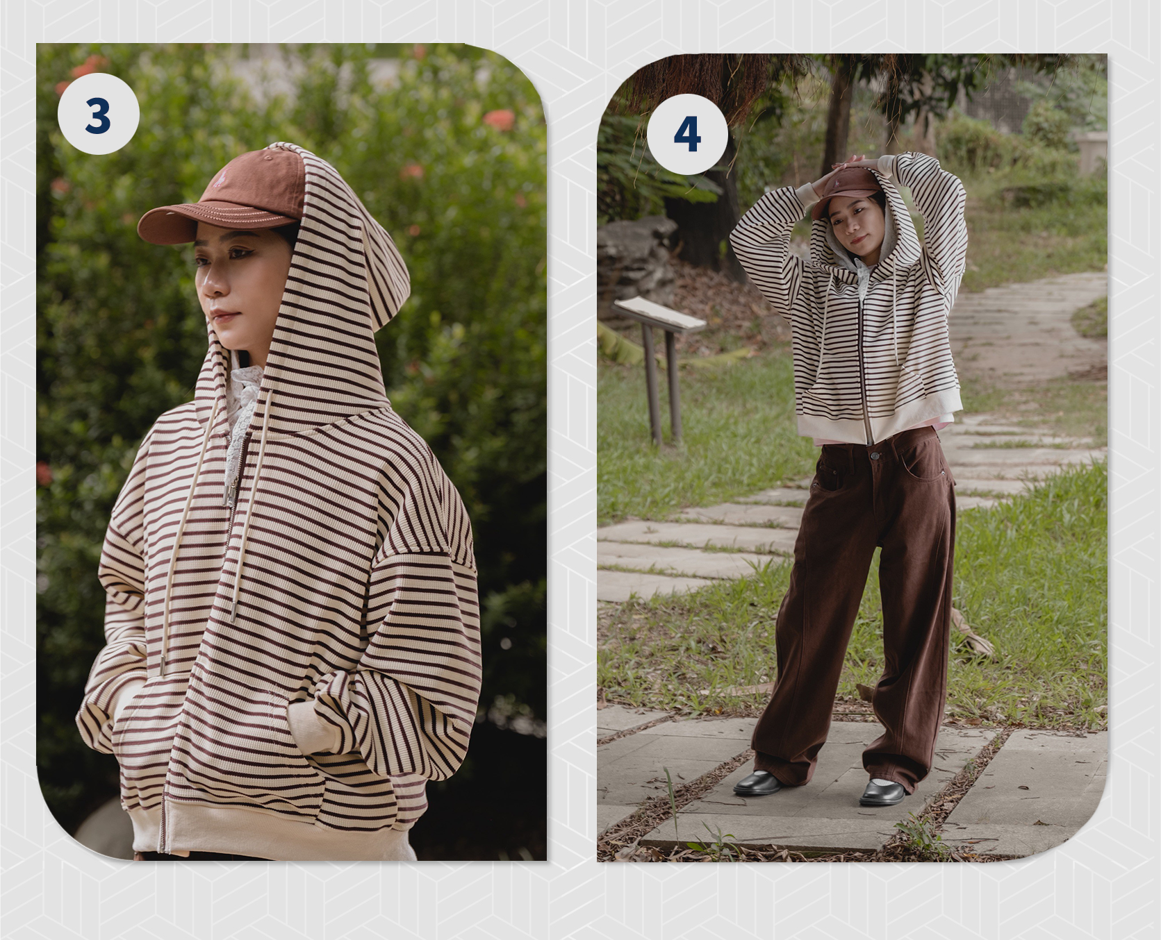 - 抽繩連帽拉鍊的設計,搭配條紋造型更加百搭