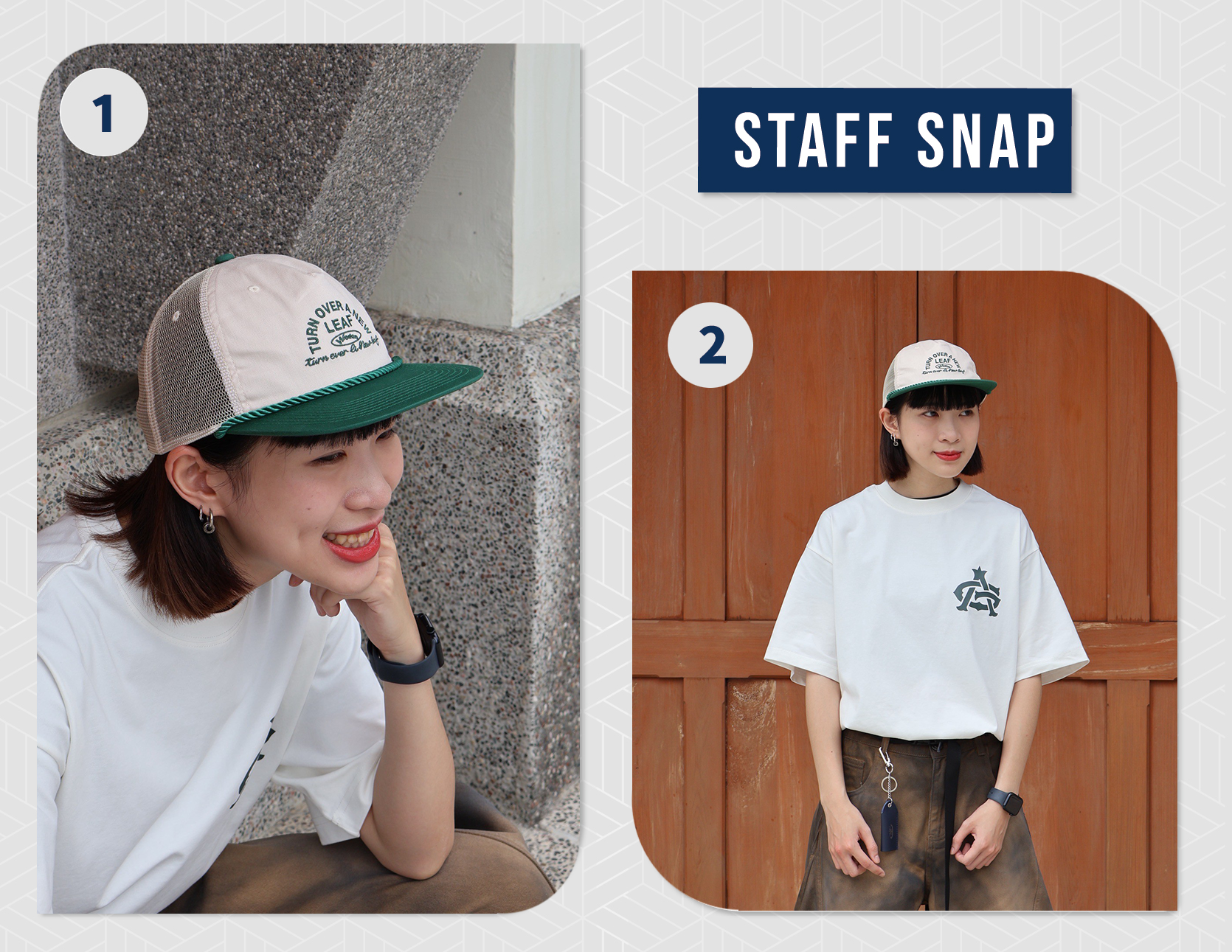 - 本次帽款採用經典 Trucker Hat 網帽設計,結合復古五片帽結構,展現濃厚的美式懷舊風格,面帽身以單片布料剪裁,搭配頂部內褶車線細節,打造自然挺立的立體輪廓,無須額外支撐也能穩固定型,呈現俐落有型的視覺效果