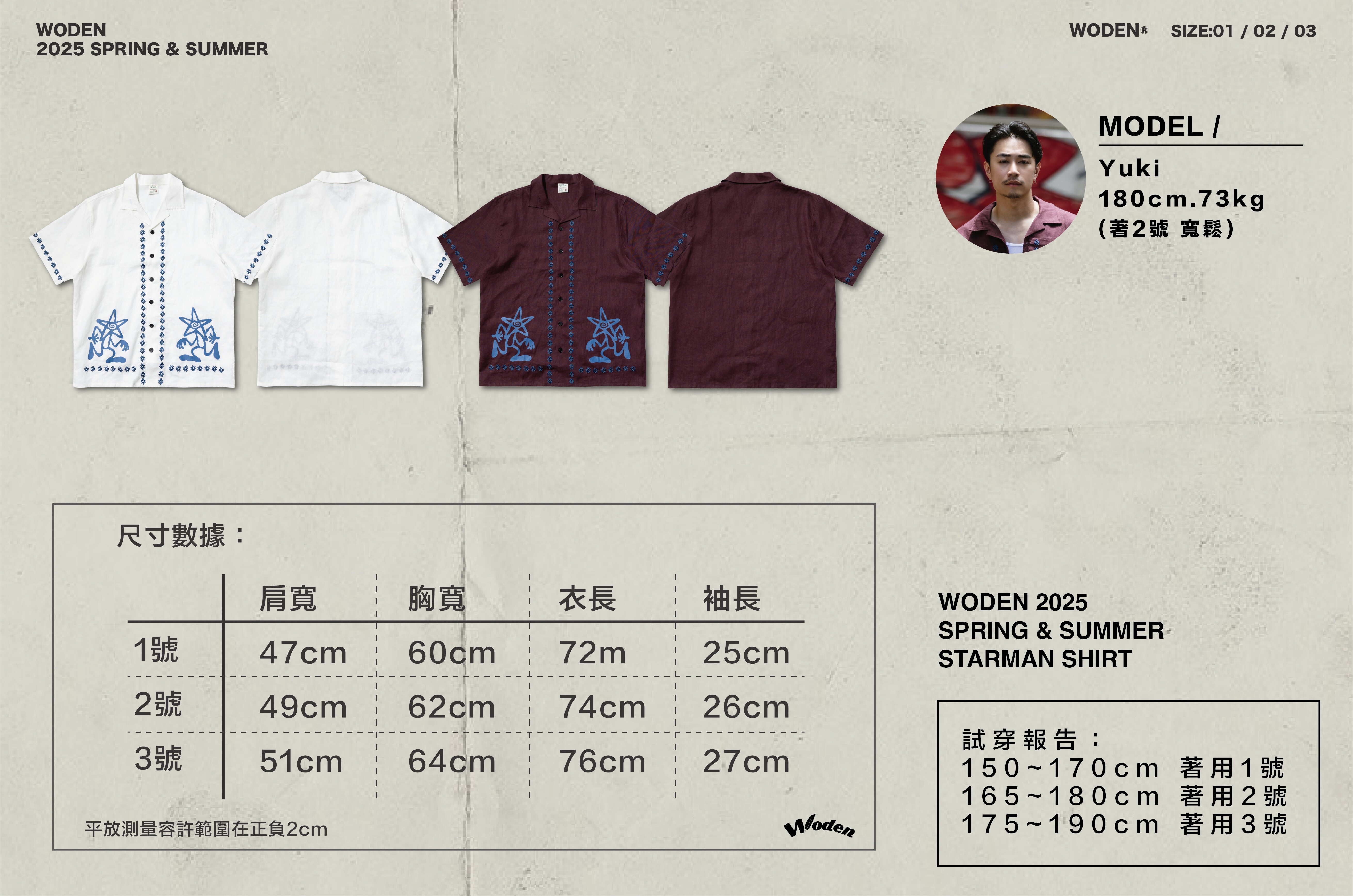 - 襯衫採用休閒寬鬆版型,正面左右下擺加入 Starman 角色印花,以街頭塗鴉筆觸描繪出叛逆與搞怪姿態,象徵「打破規則」的態度。同時搭配整齊排列的小花圖騰刺繡,展現「規律與秩序」氛圍,兩種矛盾對比之下,更突顯出自由與個性的視覺張力