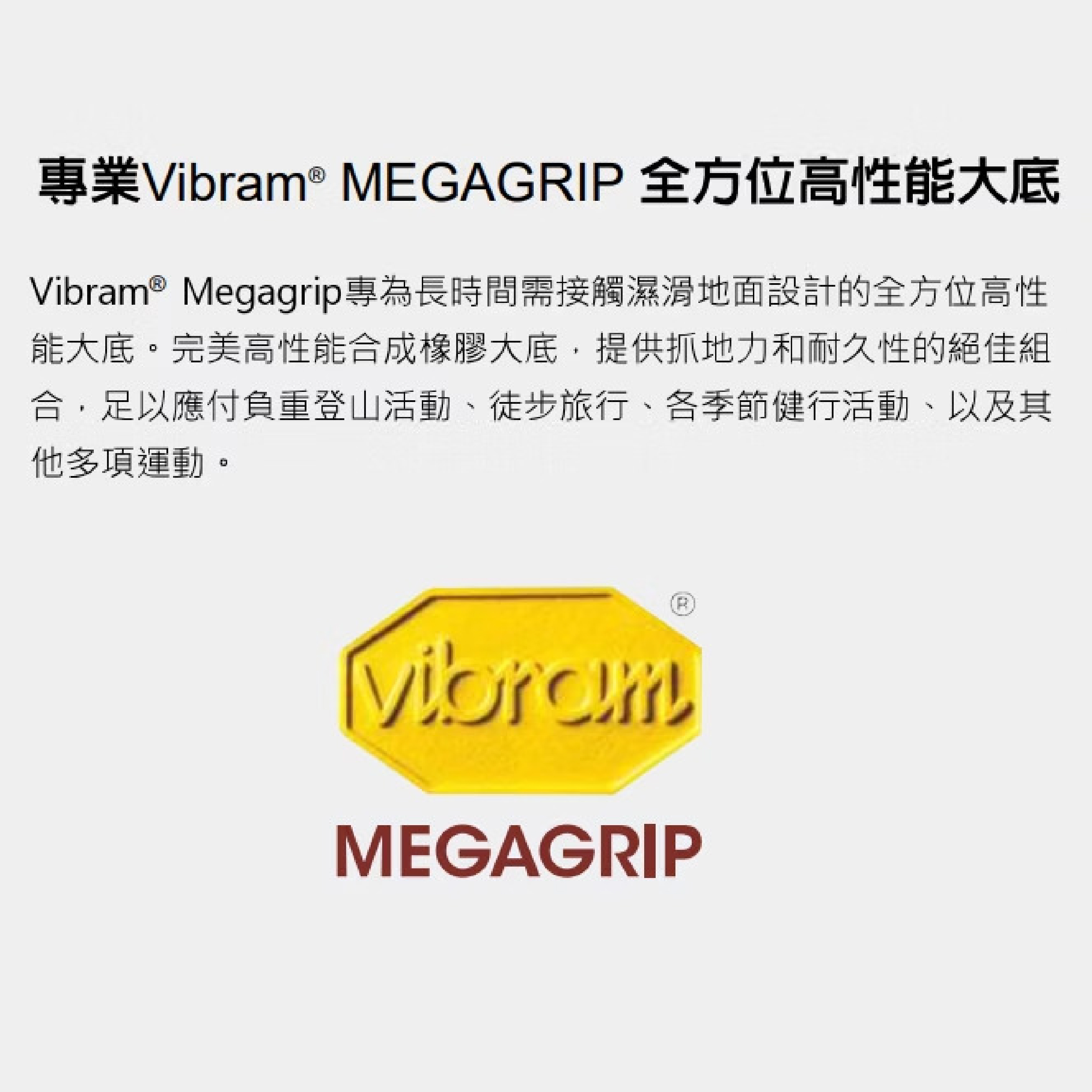 - Vibram MegaGrip®高性能橡膠大底,具有乾濕地表面無與倫比的抓地力