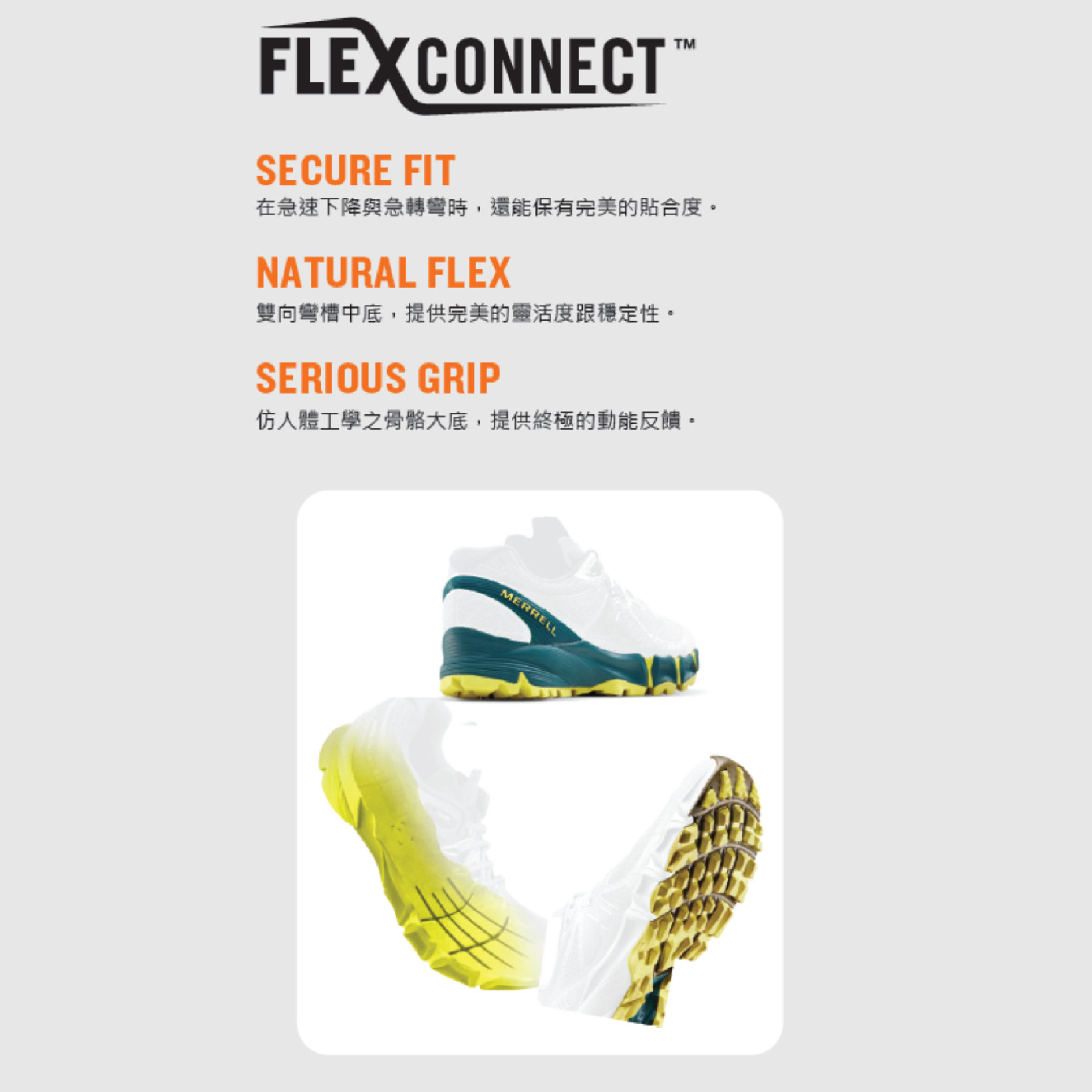 - FLEXconnect® 彎曲凹槽中底,增強敏捷性與穩定性