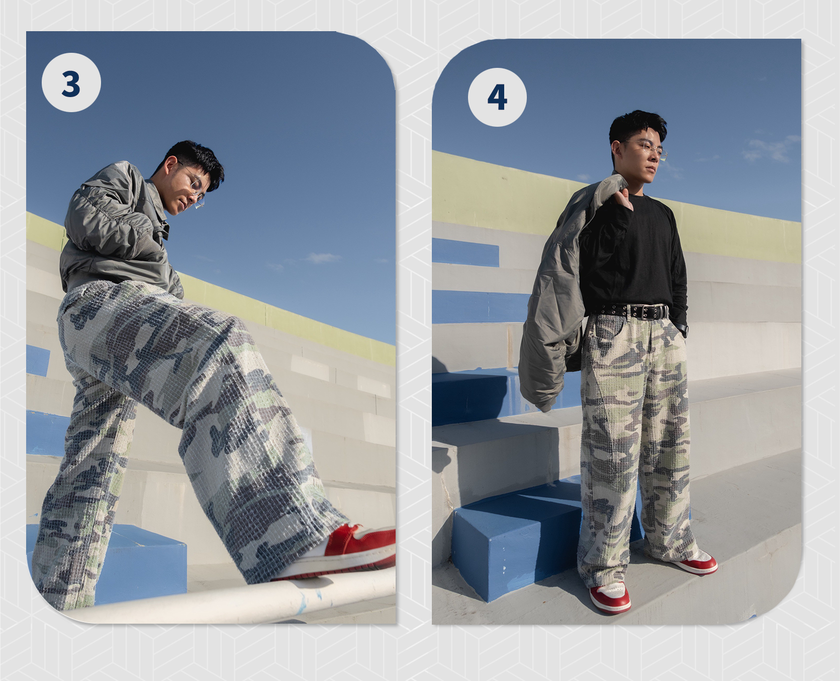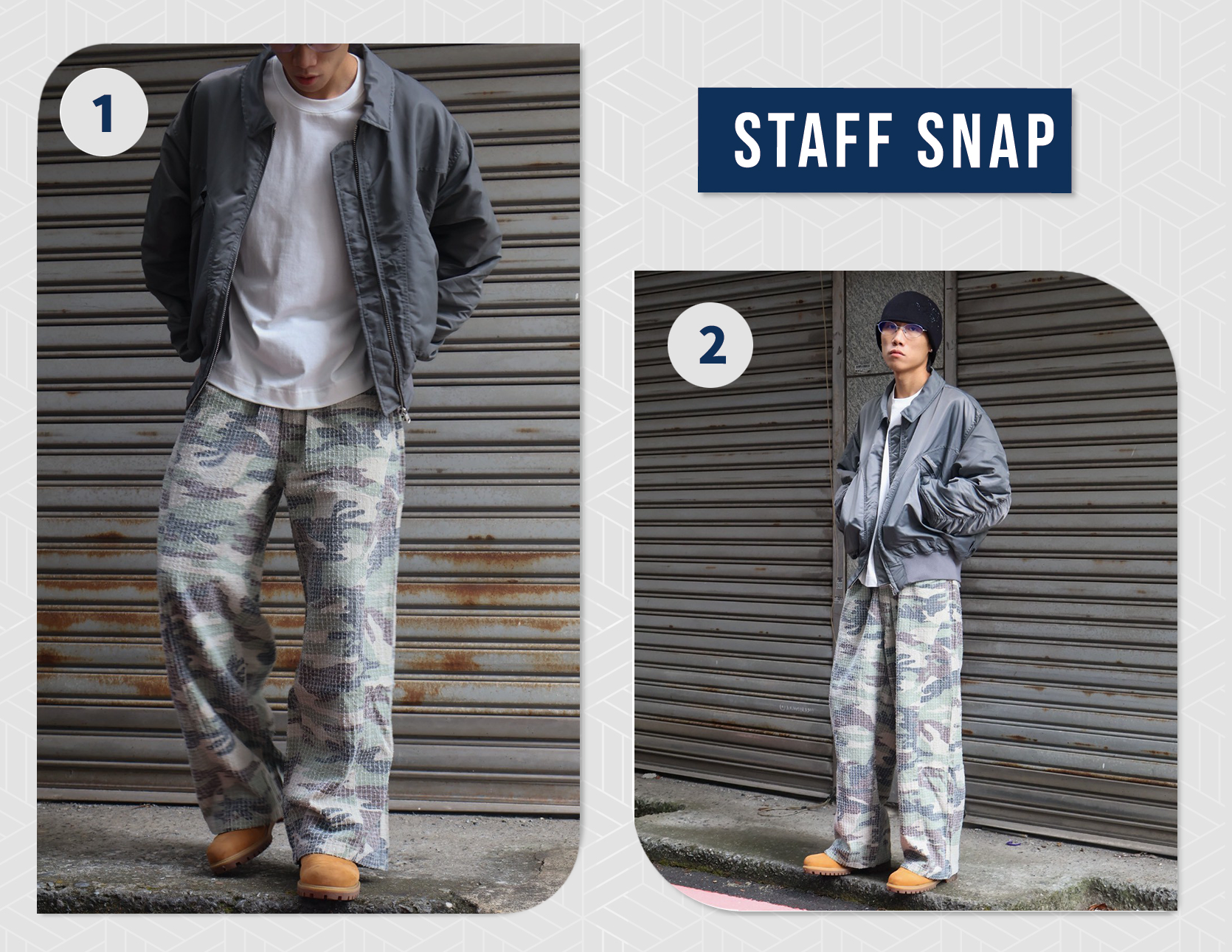 - 布料使用破壞迷彩,呈現舊感視覺
