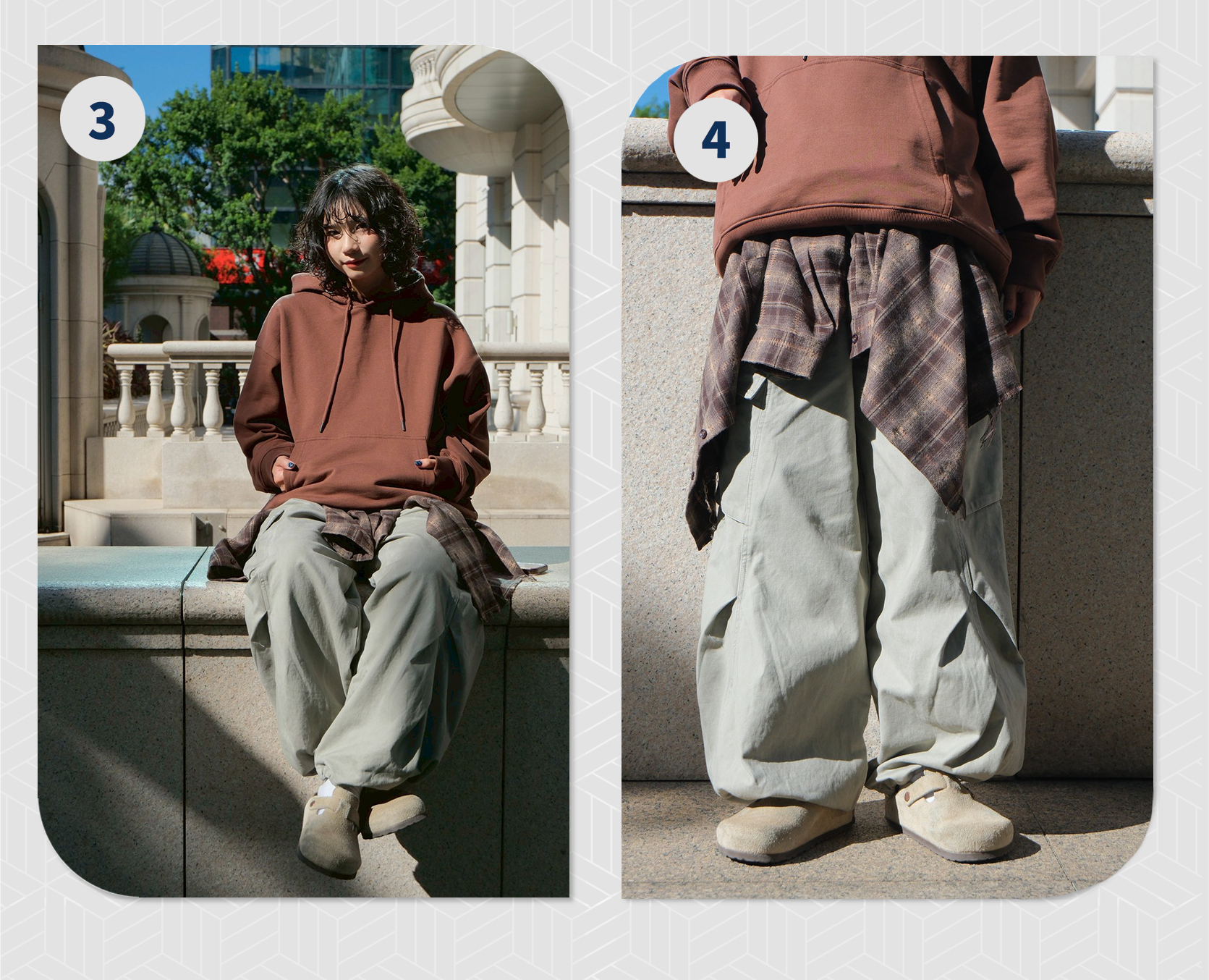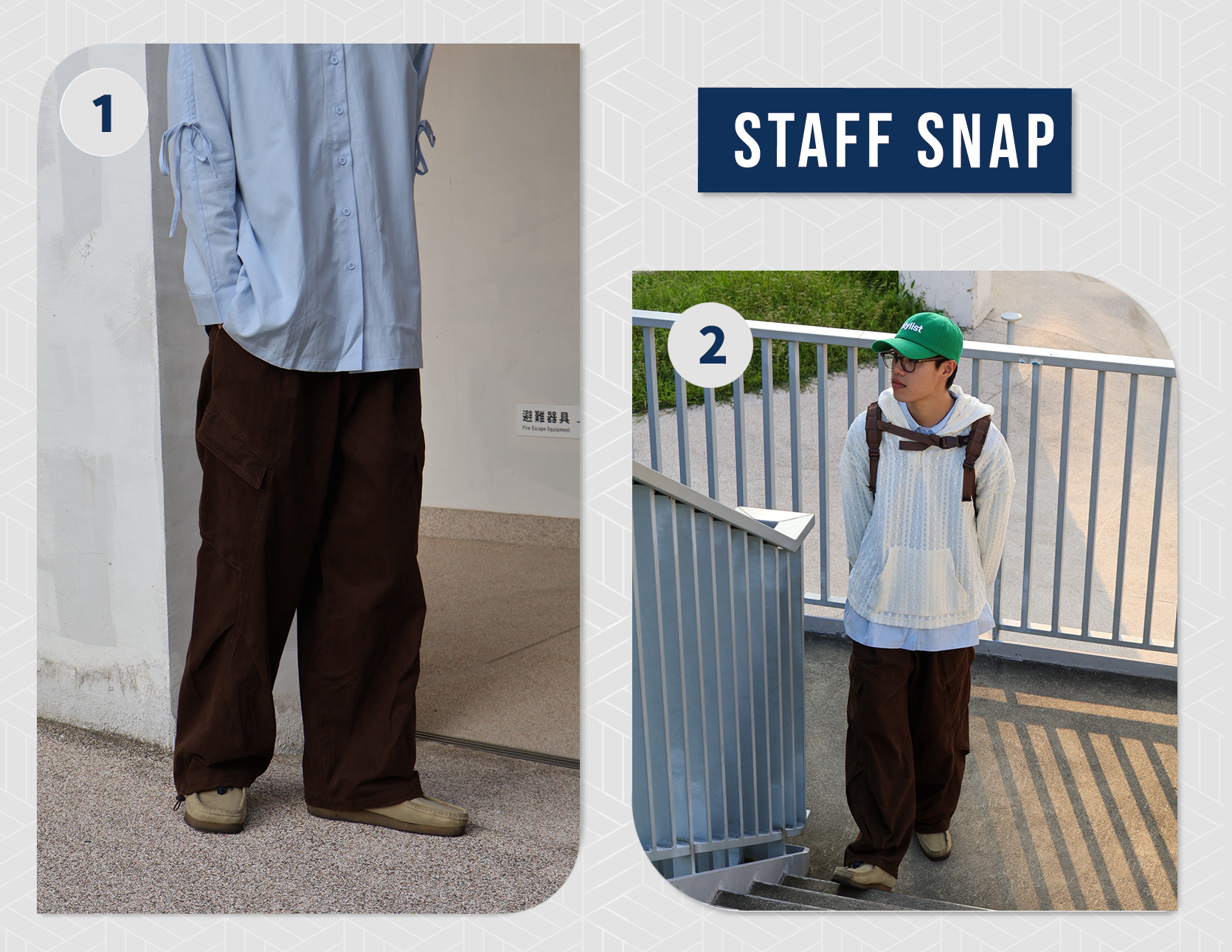 - 褲管全放慵懶輕鬆,褲管縮口簡潔俐落