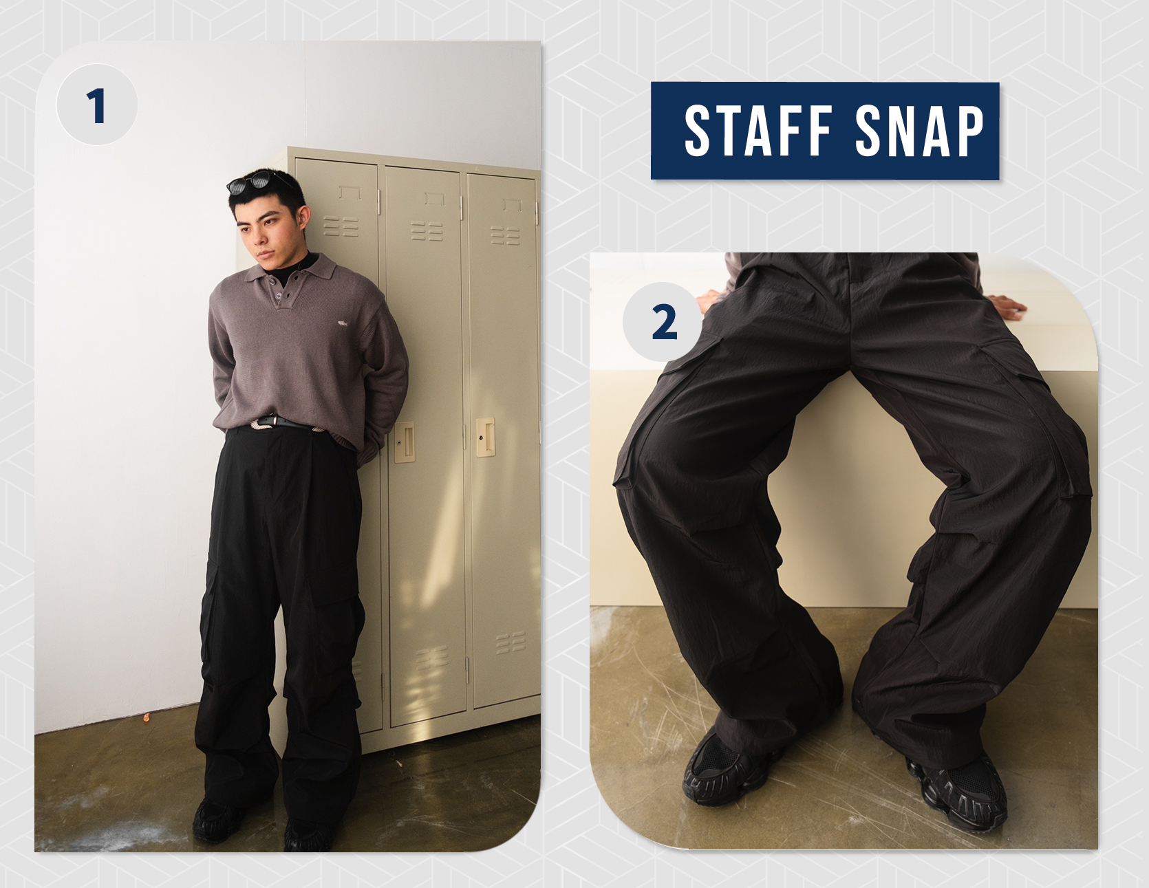 - 金屬尼龍喇叭長褲,配置六口袋可置物