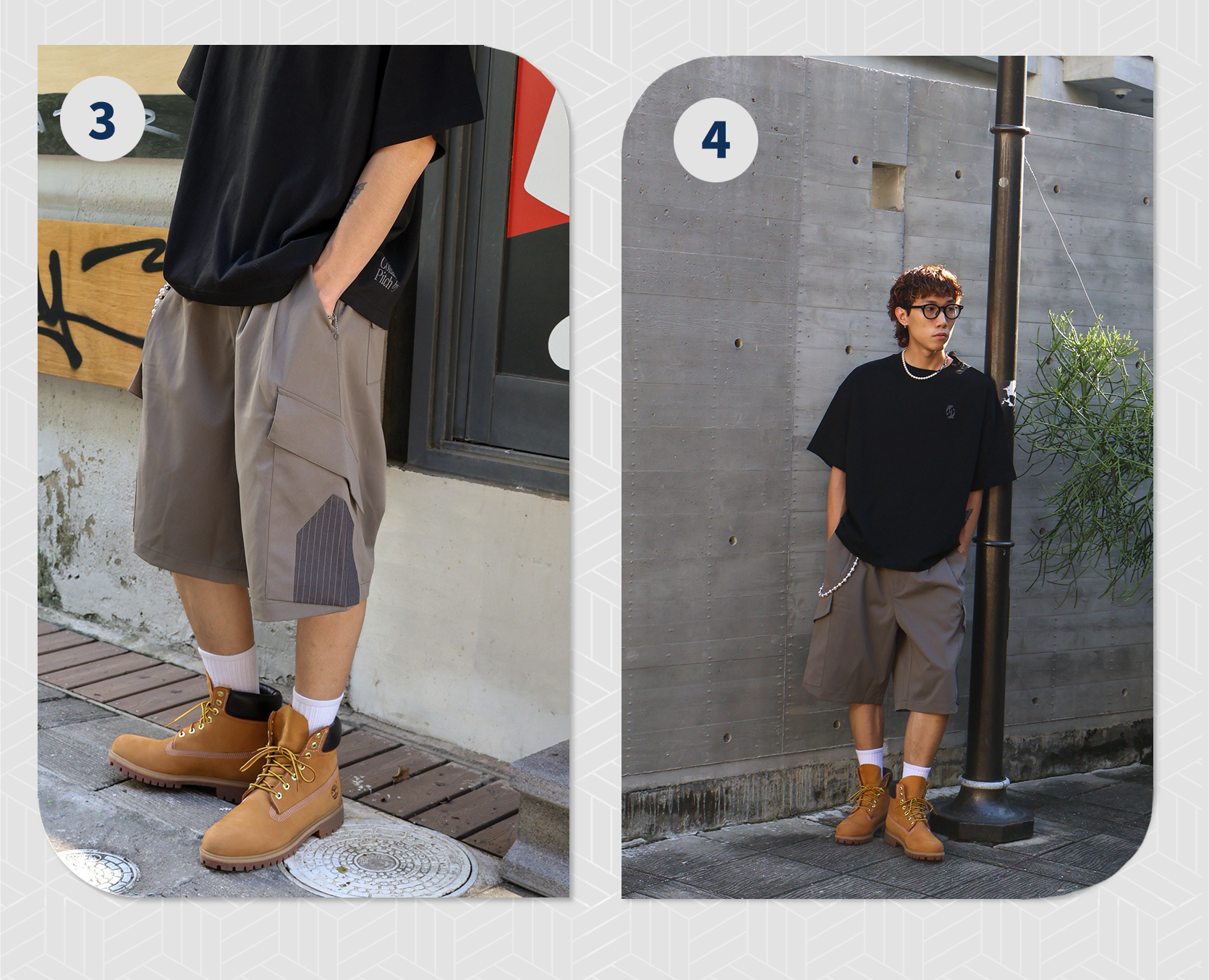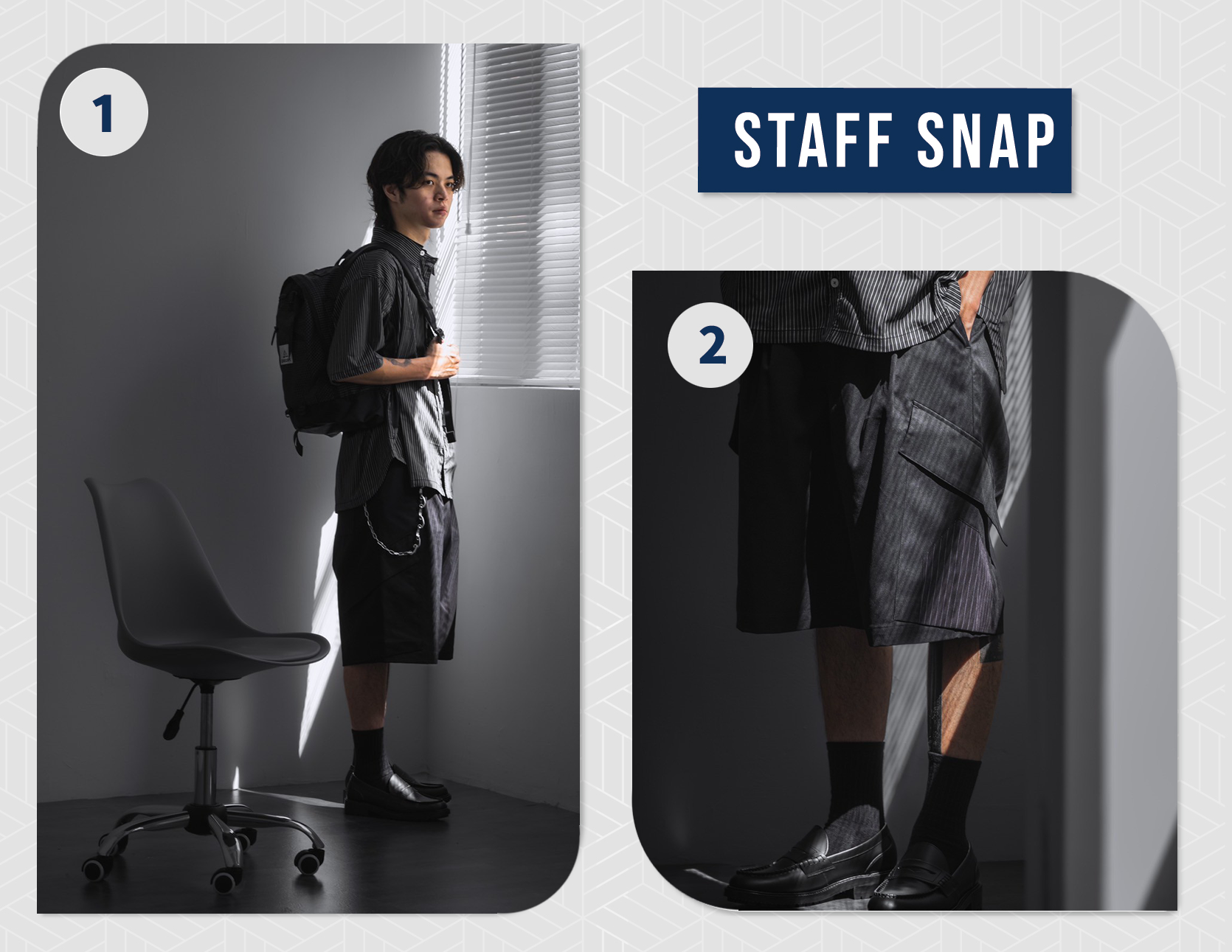 - 左側以條紋布點綴,兼具收納與造型;右後口袋同樣配置拼接條紋布,運用細節呼應整體設計