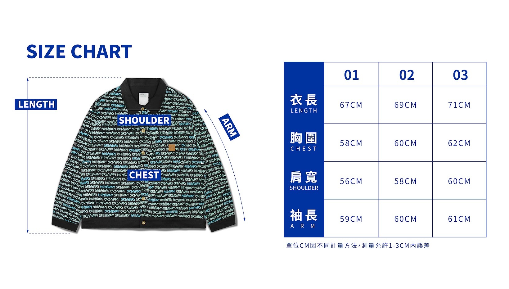 01:衣長67cm / 胸寬58cm / 肩寬56cm / 袖長59cm