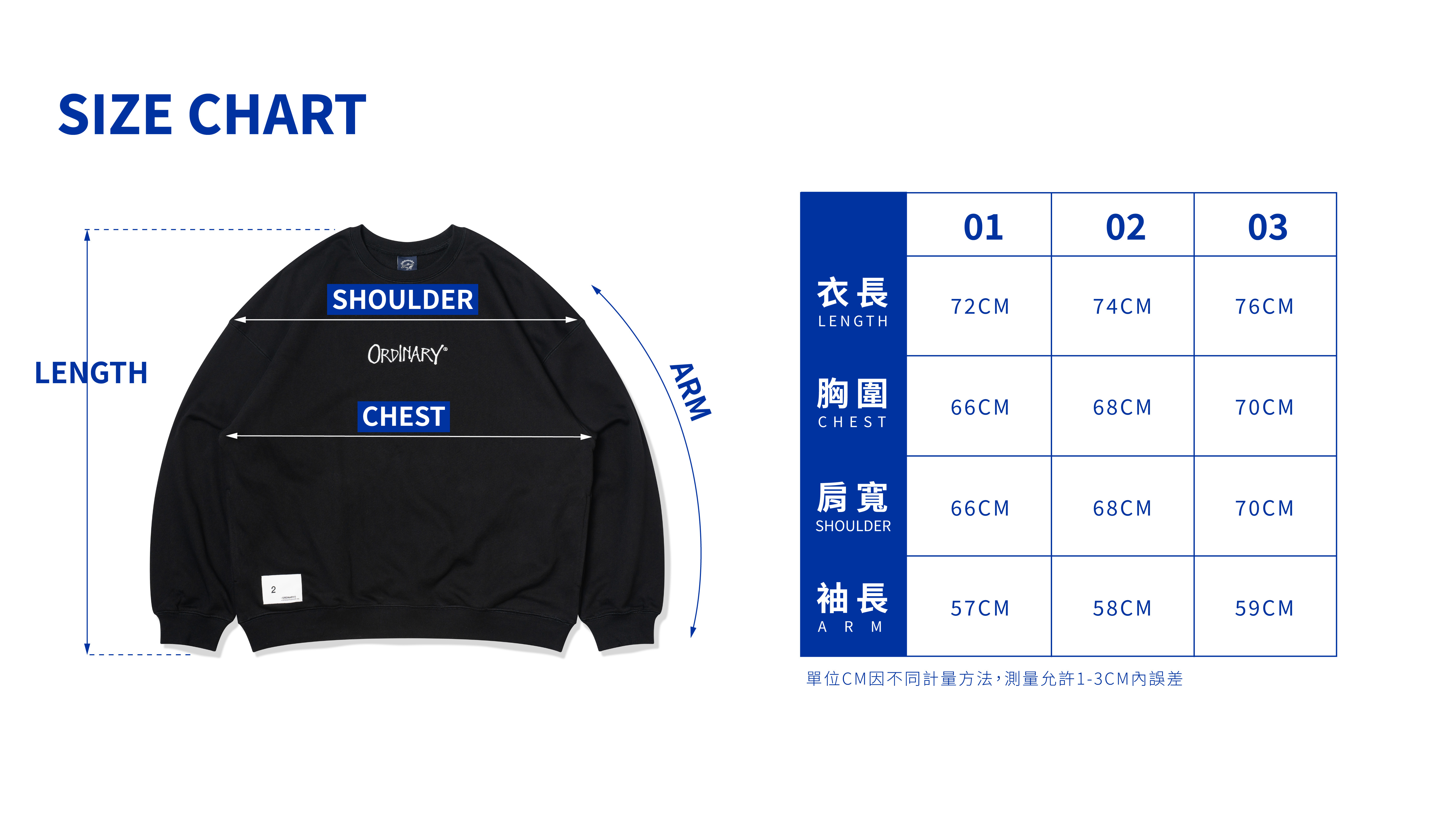 03 : 衣長76cm / 胸寬70cm / 肩寬70cm / 袖長59cm