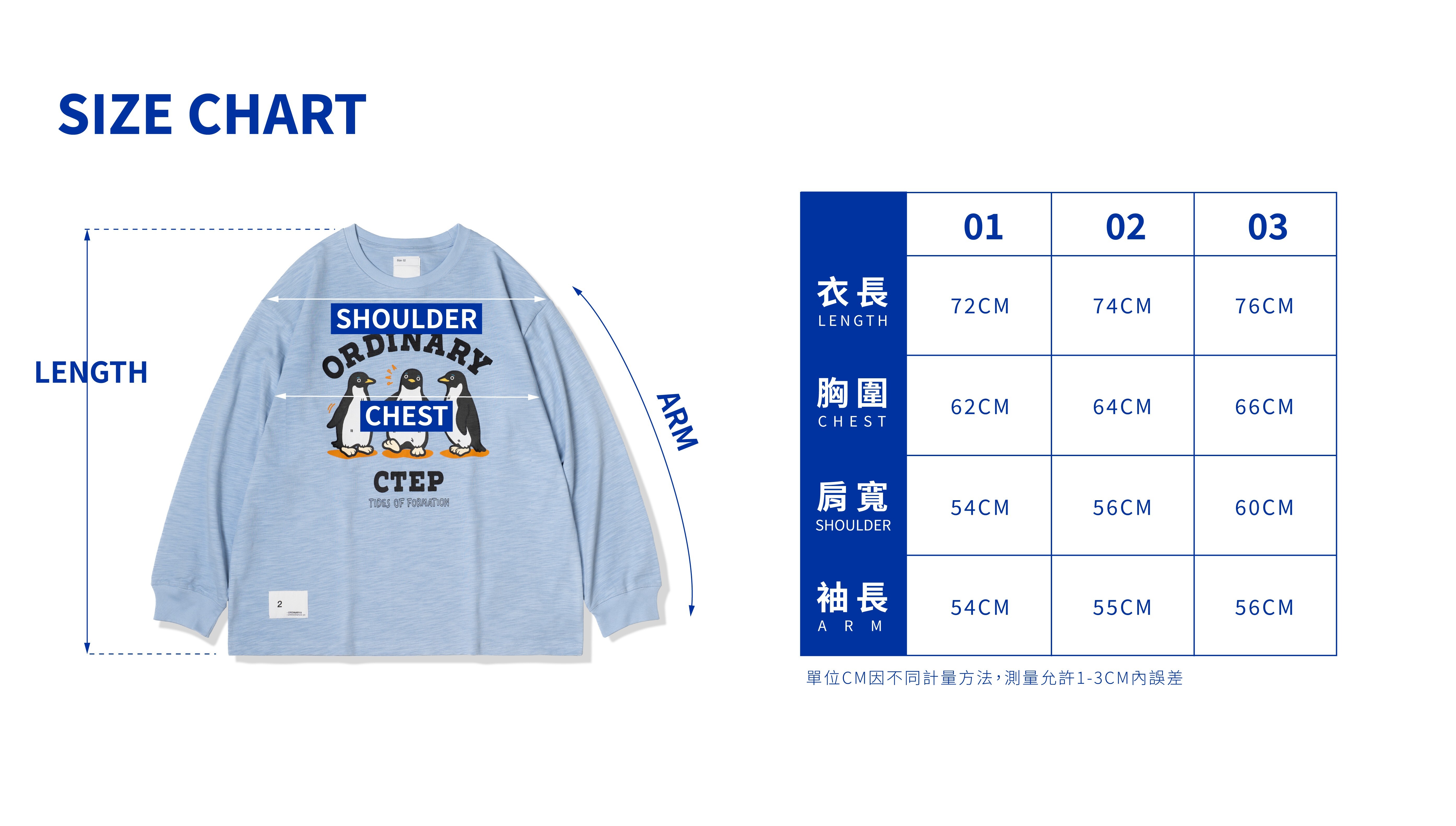 03 : 衣長76cm / 胸寬66cm / 肩寬60cm / 袖長56cm