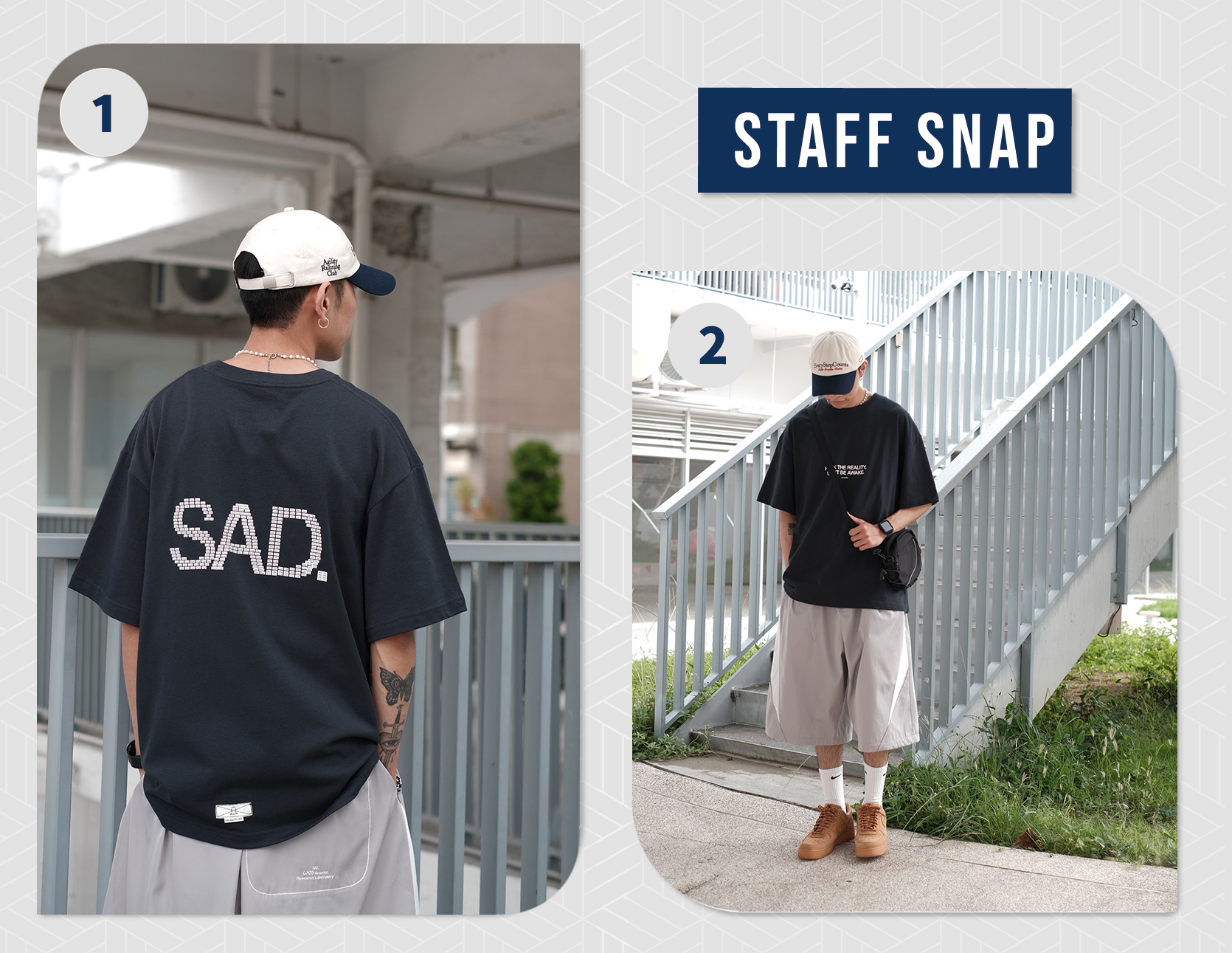 - 後身透過印製直接的情緒單詞製作,由四組負面情感詞彙構成單位形,以排列方式組合出大幅的「SAD.」字樣,做出高壓時代的精神表態