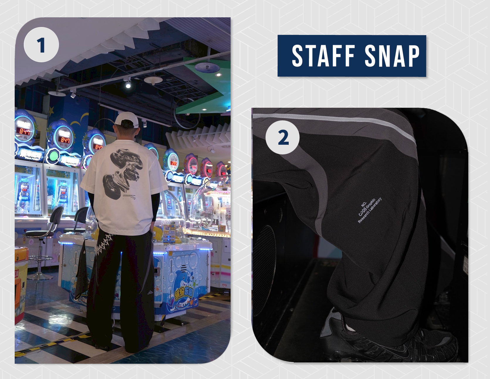 - 經典側條運動褲外觀設定,寬鬆落地Baggy剪裁版型
