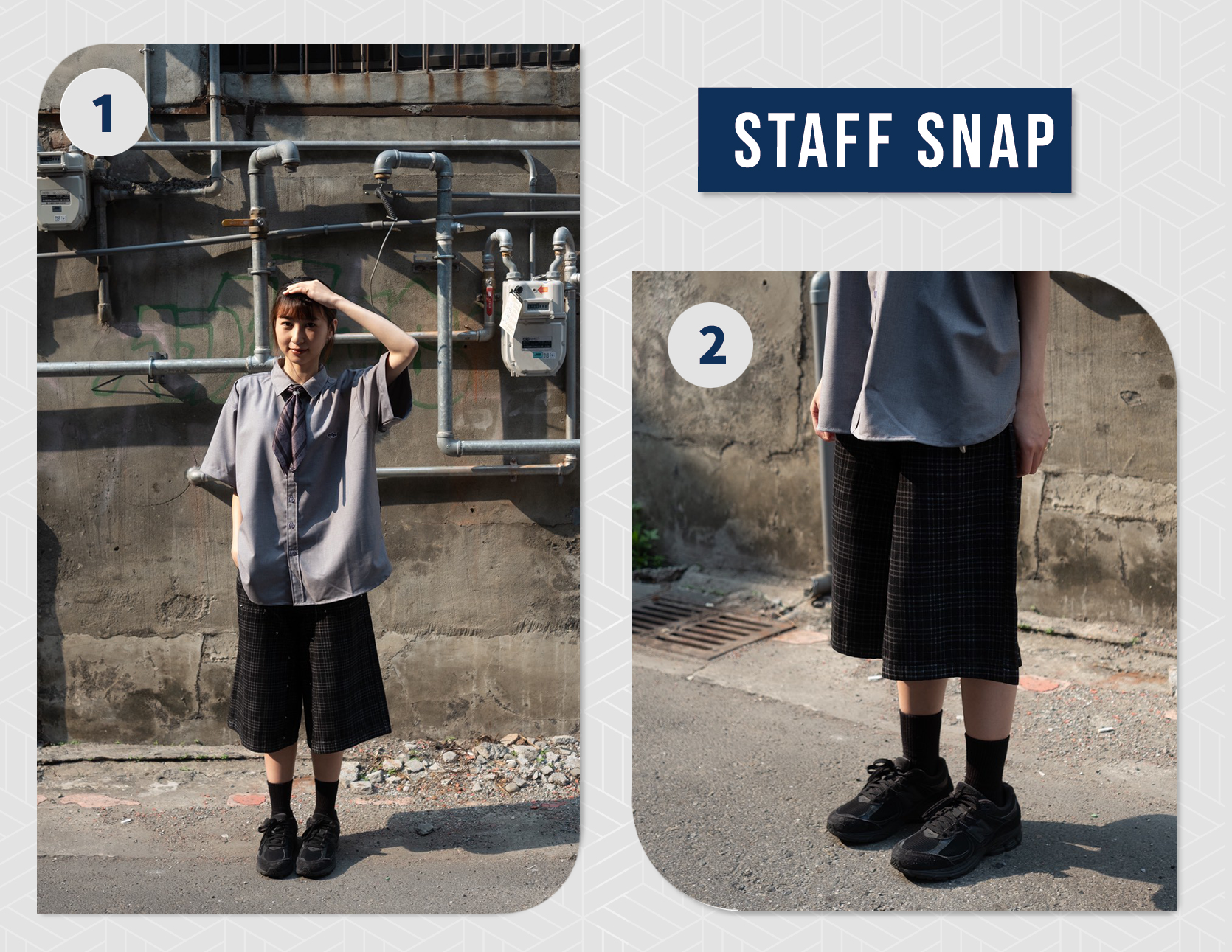 - 七分褲長設定,搭配格紋線條製造層次